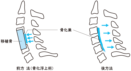 背中側の椎弓を切除(または形成)することにより、脊髄の圧迫を解除する手術法が一般的です。