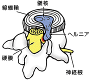 椎間板の一部がとび出て、神経を圧迫したり神経に触れたりすることで症状が出ます。