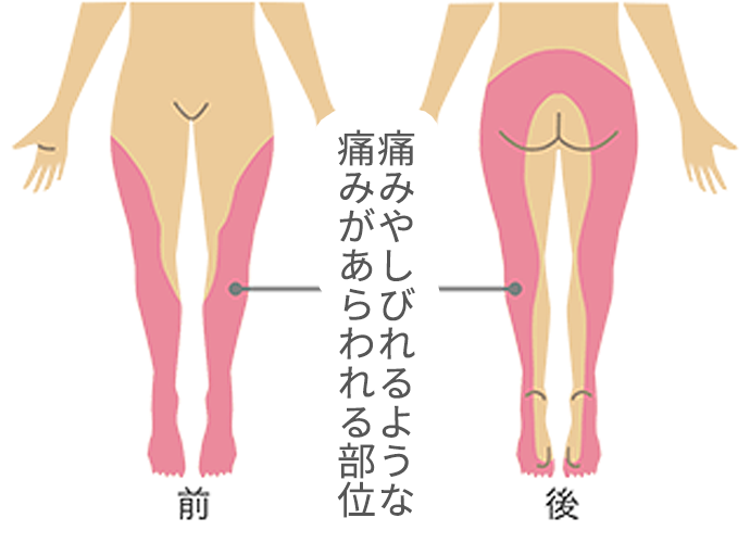 ・お尻、太ももの後ろ側、ふくらはぎ、足にかけて、鋭い痛み、しびれ(一部分のみに強い痛みを感じる場合もあれば、下肢全体に強く感じる場合もあります。)