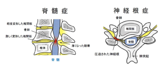 このように脊髄が前方からと後方からと、圧迫を受けるため、もともと脊柱管が狭い人は容易に頚椎症性脊髄症になります。