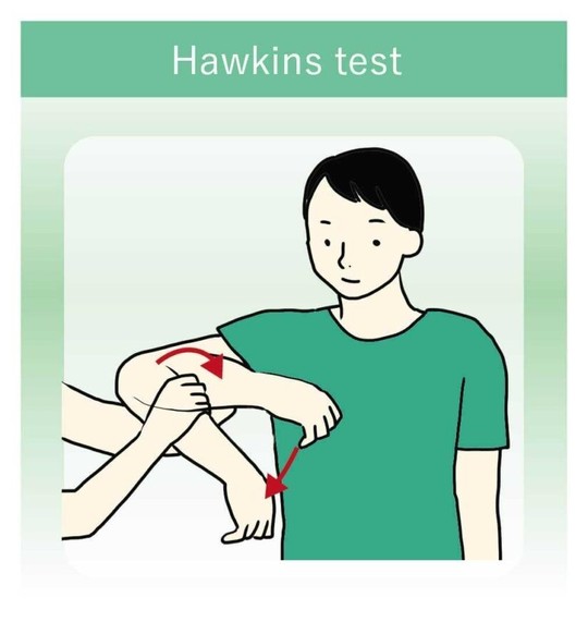 これは上腕骨の大結節を烏口肩甲靭帯の下面に押し当てるテスト法であり、疼痛がみられれば陽性。