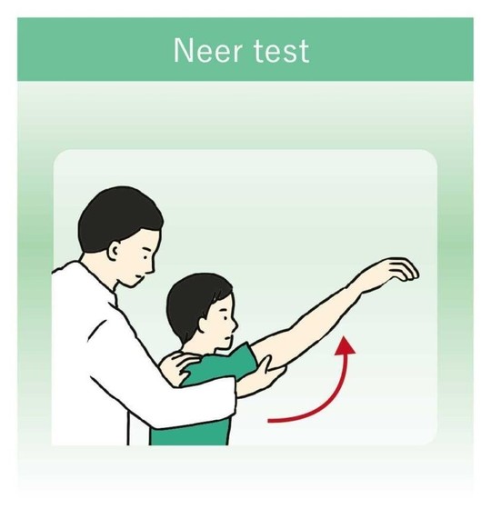これは上腕骨を肩峰下面に押し当てるテストであり、外転90°を過ぎたあたりで疼痛がみられれば陽性。