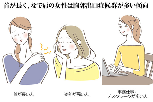 以下のような人では、通り道が圧迫される状態になるため、胸郭出口症候群になりやすいと考えられています。