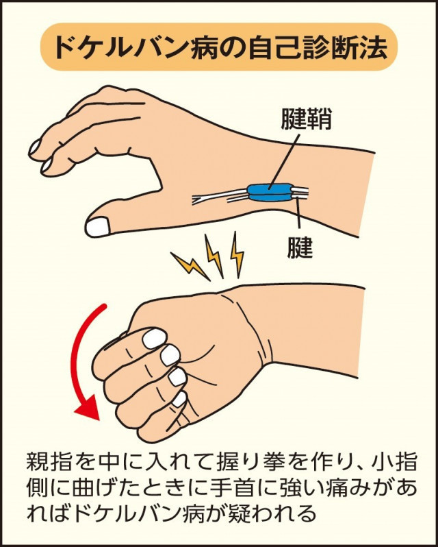親指を伸ばしたり広げたりする働きをする腱が、それらを包んでいる腱鞘との間に炎症を起こして発症します。