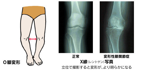 問診や診察、触診で膝内側の圧痛の有無、関節の動きの範囲、腫れやO脚変形などの有無を調べ、X線(レントゲン)検査で診断します。