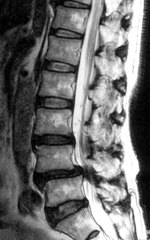 第4と第5腰椎の間で硬膜管が圧迫されている
