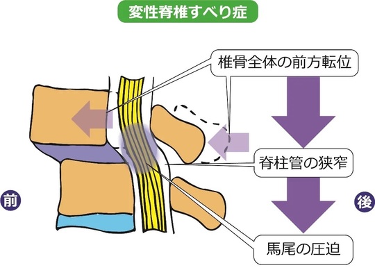すべり症では、腰椎がずれることにより脊柱管が狭くなり、馬尾神経や神経根が圧迫されて症状が出ます。