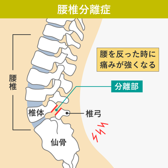 ・分離症とは、腰を反らす動作の繰り返しなどで負担がかかり、腰椎の椎弓という細く弱い部分にひびが入ります。