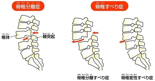 ・腰椎の椎弓の一部に骨折が起き、椎体がお腹側にずれたものが腰椎分離すべり症