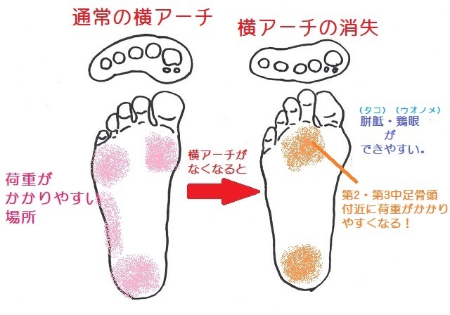 足底に不均等なストレスがかかるため、足底腱膜に負担がかかります。