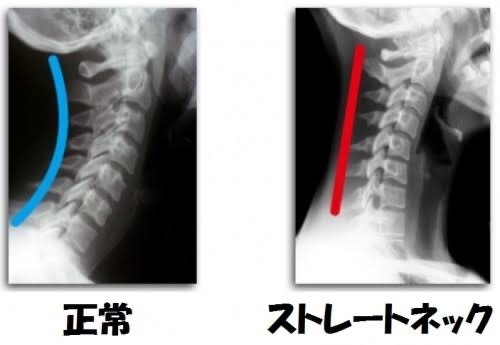 ストレートネックとは、頚椎(首の骨)の生理的な弯曲がなくなり、真っ直ぐな骨の並びになることです。