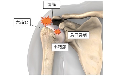 肩の関節近くで、骨同士や軟骨、靱帯の衝突やこすれが起きることで痛みを感じる疾患です。