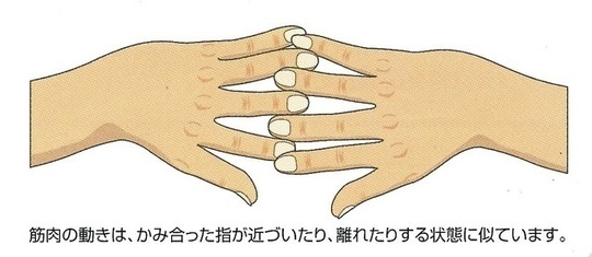 筋肉の動きは、かみ合った指が近づいたり、離れたりする状態に似ています。