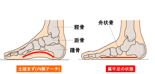 年齢による腱の変性や体重の負荷によって、この腱が断裂すればアーチは低下します。
