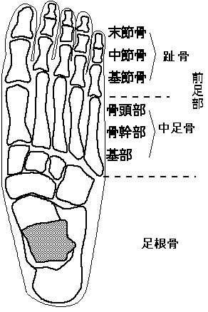 外反母趾ではこれらのアーチが崩れて扁平足になると、中ほどにある母指の中足骨が扇状に内側に開き、それから先の指は逆に靴で外側に圧迫されておこります。