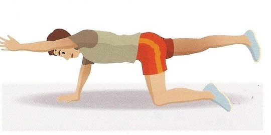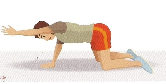 次に片方の手を上へ上げます。このとき挙上した側の腹筋(腹横筋)が働きます。