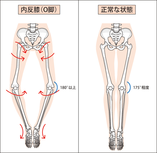 O脚(内反膝とも言われる)とは、両膝が外側に彎曲した状態で、左右の内くるぶし(足関節内果部)をそろえても、左右の膝の内側(大腿骨内果部)が接しないものです(図1)。