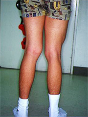 病的なものとしては、靱帯の異常(内側・外側側副靭帯などのゆるみや欠損など)、先天的・後天的な大腿骨・脛骨の形態異常(Blount病やくる病、骨系統疾患など)、外傷後の変形(骨端線損傷や骨幹部外傷など)などにわけられ、片側のみの変形では病的なものを考えます。