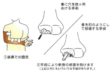 手術には、骨に穴をあける方法、骨を釘のようにして移植する方法、肋軟骨や膝の軟骨を移植する方法などがあります。