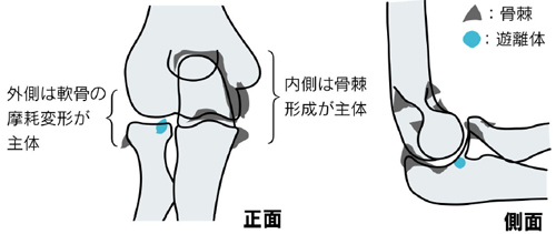病態は、外傷では関節軟骨が摩耗して骨が関節面に露出し、主に内側では過剰な骨の突起(骨棘)ができます。