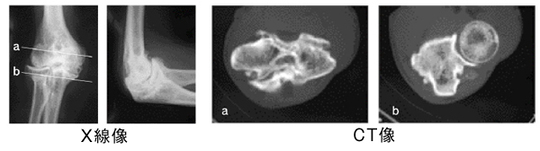 X線(レントゲン)検査では関節の隙間(関節裂隙)が狭くなり、骨棘形成、橈骨頭の肥大、軟骨下骨の硬化像が認められます。