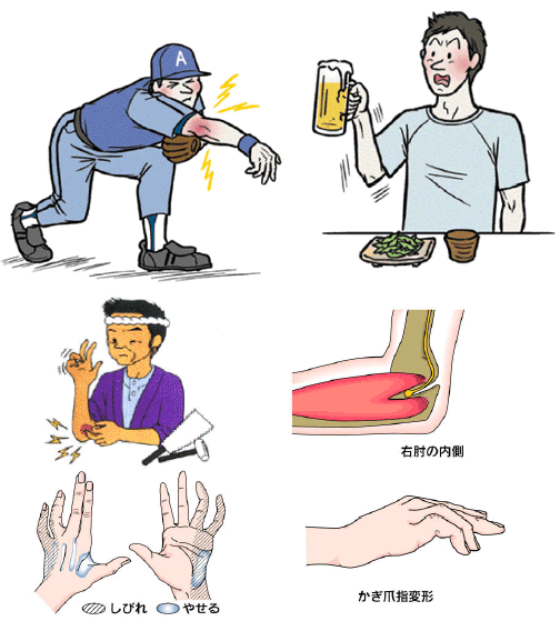変形性肘関節症が進むと肘内側を走行する尺骨神経が圧迫されて麻痺することがあり、薬指の半分と小指の感覚が鈍くなり、手指の動きが不器用になります。