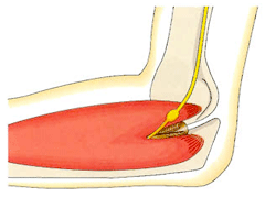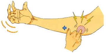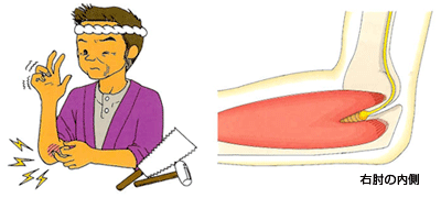 肘の内側を軽くたたくと小指と薬指の一部にしびれ感がはしります。