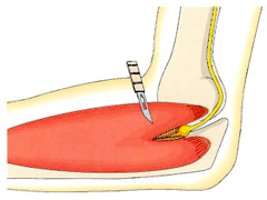肘部管とは、肘の小指側の骨と肘の頭の骨の間の溝の部分を中心とする骨と靱帯に囲まれたトンネル状の部分の事です。