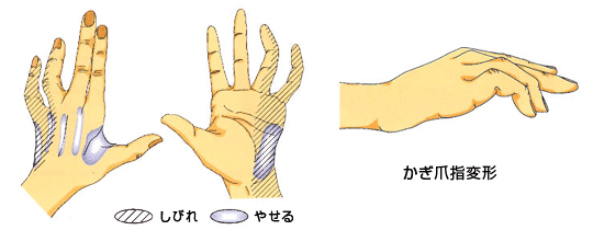 麻痺が進行すると手の筋肉がやせてきたり、小指と薬指の変形がおきてきます。