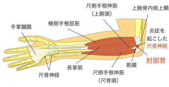 肘の内側で神経(尺骨神経)が慢性的に圧迫されたり牽引されることで発症します。