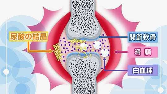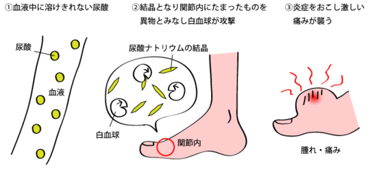 痛風とは、血液中に溶けきれなくなった尿酸が結晶化し、関節などの組織に炎症を引き起こす病気のことです。