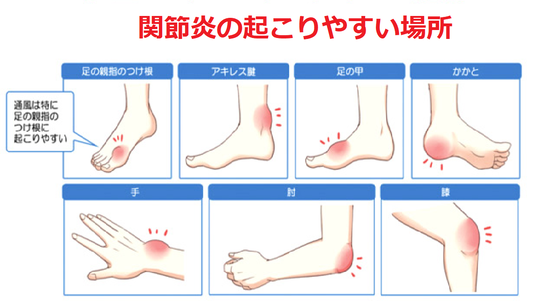 痛風発作は足の親指の付け根だけでなく、足・膝・手などのさまざまな関節にも生じます。