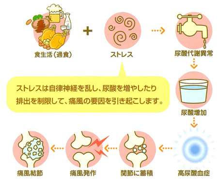 痛風は、血液中の尿酸の濃度が高い状態が続く高尿酸血症に起因する病気です。