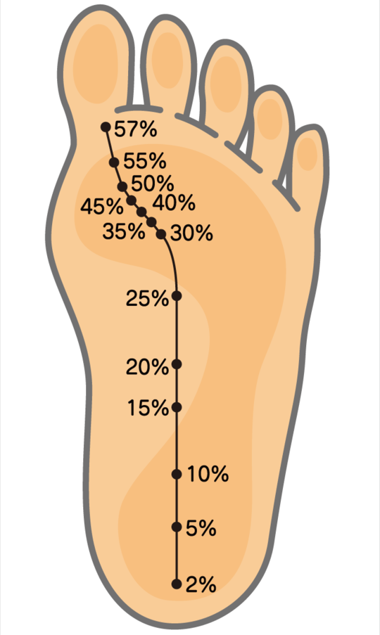 正しい歩行におけるCOPの軌跡は、踵部中央から始まり、足底中央よりやや外側を通りながら前方移動し、ここから内側に移動して母指に達するパターンを示します。