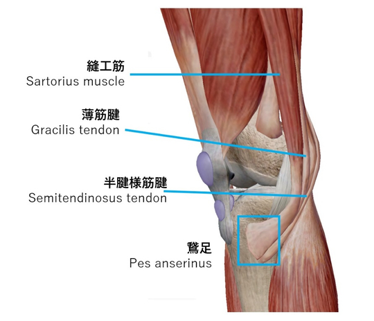 「鵞足」とは、脛骨というスネの骨の内側(膝から5-7㎝ほど下)に位置し、縫工筋、半腱様筋、薄筋と呼ばれる筋肉の腱が骨にくっつく部位(付着部)です。