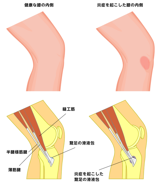 鵞足炎(がそくえん)と言い、やはりオーバーユース(使い過ぎ)が原因です。