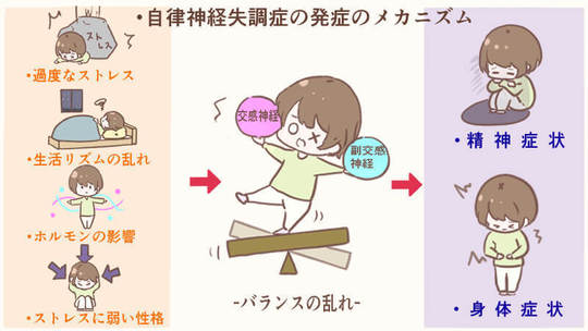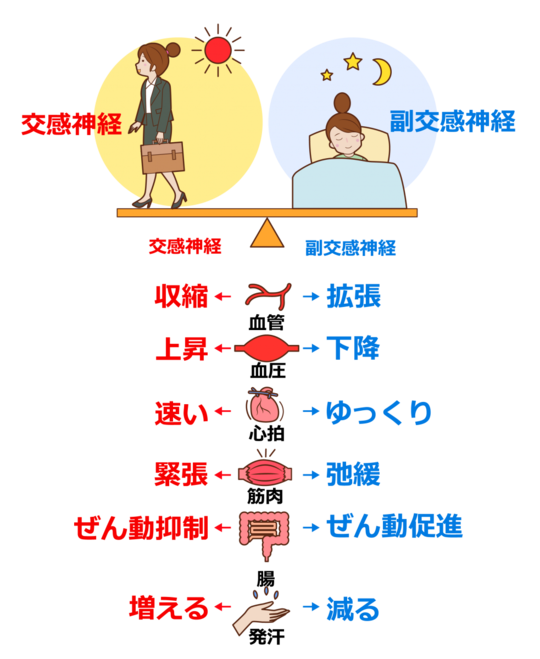 健康な人では、正反対の役割を持つこれらの神経がバランスを取りながら正常な状態を保つことができますが、ストレスやホルモンバランスの乱れによって片方の神経が過剰に興奮した状態が続くと、さまざまな症状が現れるようになります。