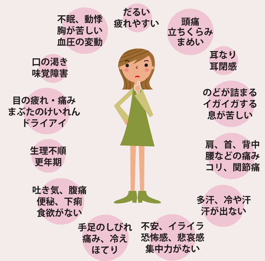 倦怠感、疲労感、熱っぽい感じ、手足のしびれ、動悸、息切れ、めまい、頭痛、不眠、寝汗、食欲不振、胃痛、吐き気、肩こり、背中の痛み、腰の痛み、腹痛、下痢、便秘など