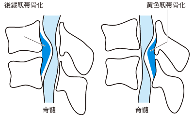 後縦靭帯は脊髄の前方に位置し、黄色靭帯は脊髄の後方に位置するため、それぞれの靭帯が分厚くなり骨のように硬くなると、脊髄が圧迫され症状(脊髄症状)が出現します。
