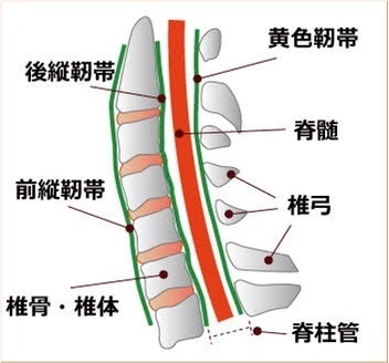椎体(背骨の四角い骨)の後方で後縦靭帯が、椎弓(背中側の骨)の前方で黄色靭帯という靭帯が存在し、