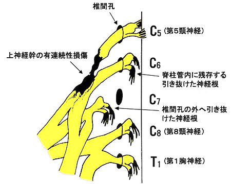 外傷の種類や力の加わり方によって、神経根が脊髄から引き抜けたり(引き抜き損傷)、神経幹から神経朿のレベルで神経が引き伸ばされたり(有連続性損傷)、断裂したりします(図2)。
